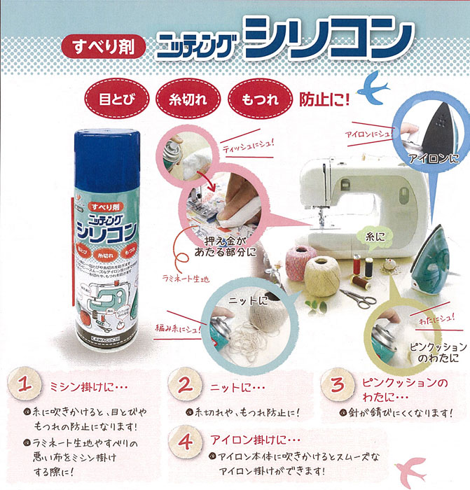 ミシンの目とびや糸切れ、編み機の絡みなどを防ぐスプレータイプの潤滑剤です。