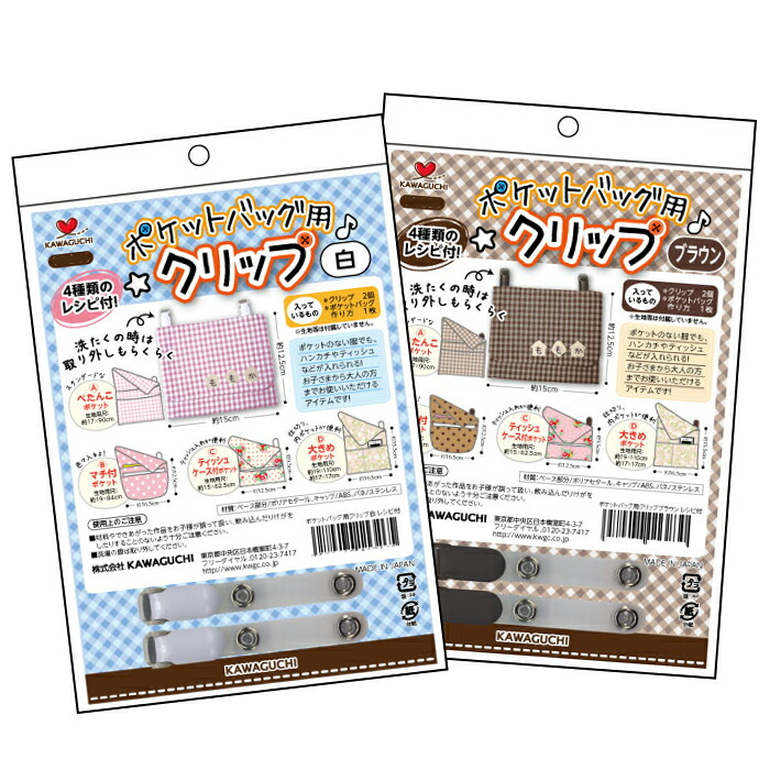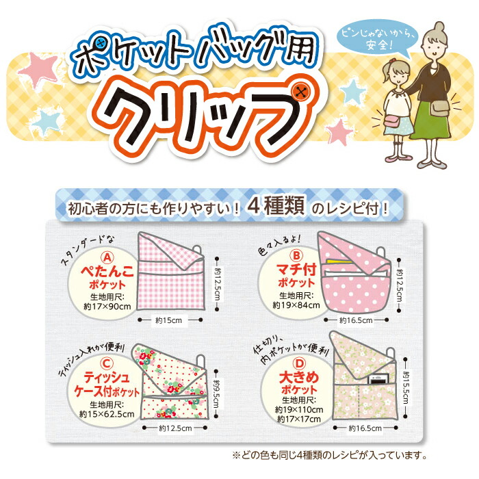 ■クリップ(2個)とポケットバッグの作り方(4種類)のレシピ1枚付き。