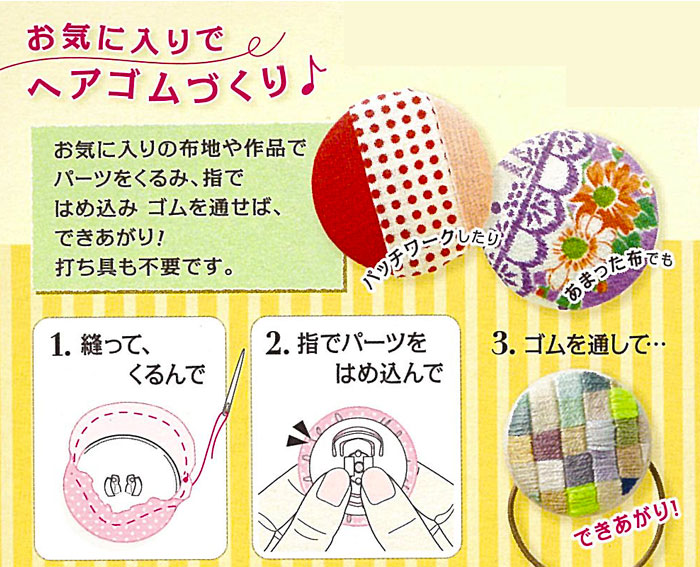 小さな作品を、ヘアゴムに簡単に仕立てられます。
