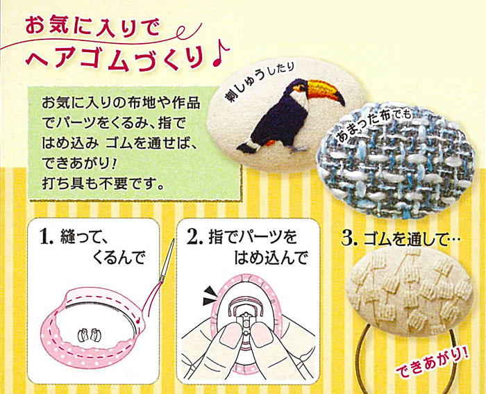 小さな作品を、ヘアゴムに簡単に仕立てられます。