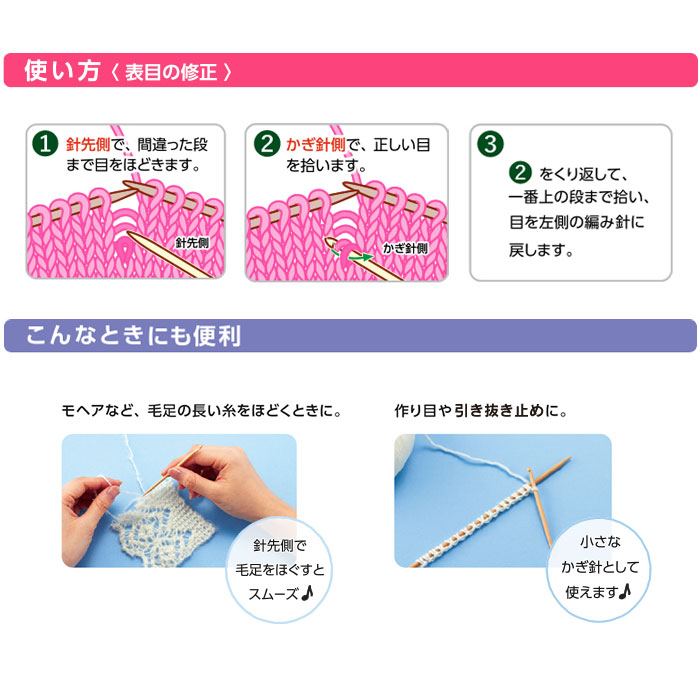 編み目を落とした時や編み間違えた時に使います。作り目や引き抜止めに、モヘアなどの毛足の長い糸をほどく時にも便利です。