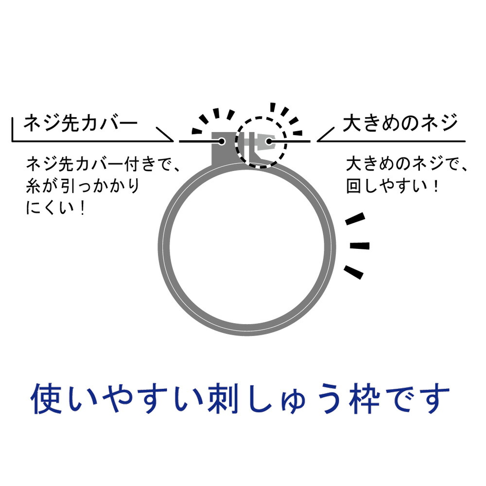 ネジ先カバー付きで糸が引っかかりにくく、大きめのネジで回しやすい、使いやすい刺しゅう枠です。