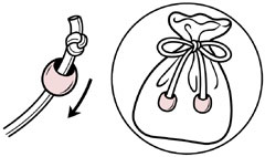 ひもの結び目をカバーします。ひもの端を小さい穴から通し、結び目を作ります。引き戻すようにして結び目を引っ張ります。全8色。