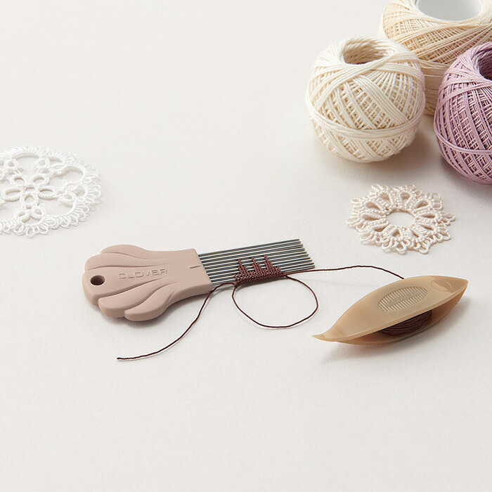 タティングレースのピコットの大きさを揃えて作るためのツールです。コームに糸をかけて編むだけで、かわいいモチーフがきれいに作れます!