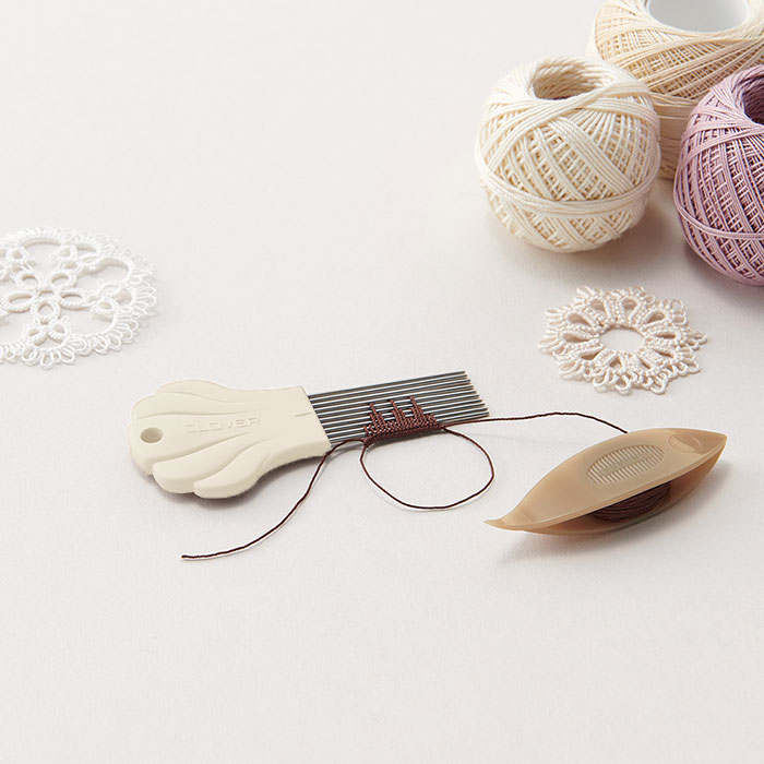 タティングレースのピコットの大きさを揃えて作るためのツールです。コームに糸をかけて編むだけで、かわいいモチーフがきれいに作れます!