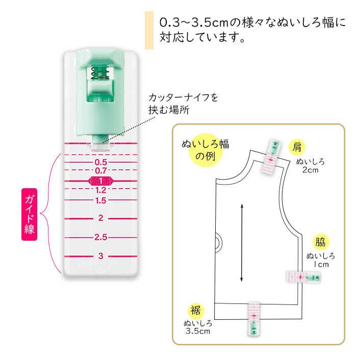0.3~3.5cmの様々な縫いしろ幅に対応しています。(0.3/0.5/0.7/1/1.2/1.5/2/2.5/3/3.5cm)