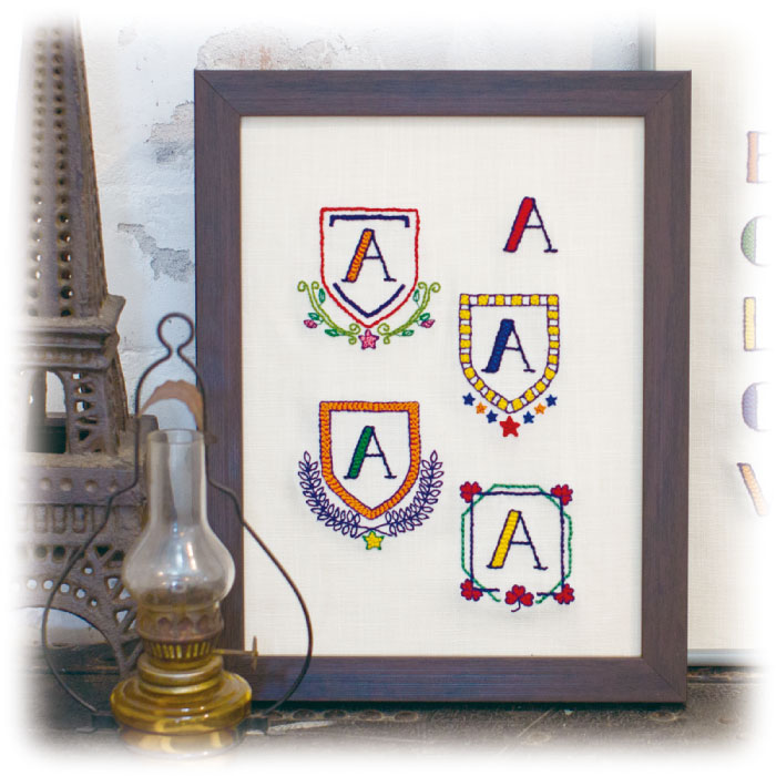 アルファベット26文字とエンブレム枠、かわいいワンポイント図案(30図案)を掲載しています。