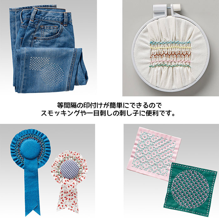 ドットのしるしを付けてから、お好みのステッチを選んで刺しゅう糸などを使いスモッキングや一目刺しの刺し子を楽しんでください。