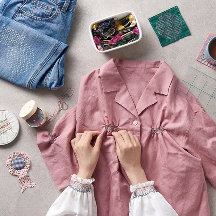 付け襟やTシャツ、子ども服など、市販のアイテムにスモッキングをプラスしても楽しめます。