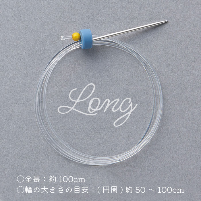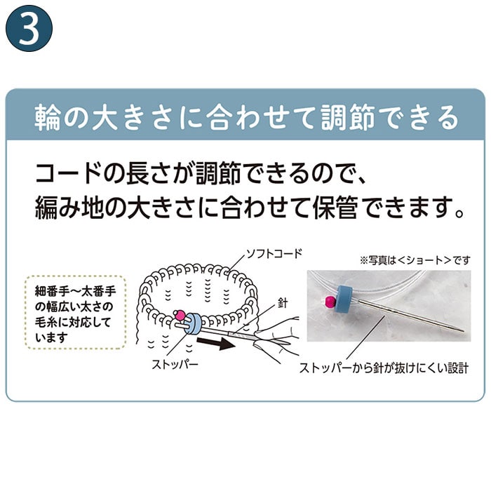 編み目が移しやすく、コードの長さが調節できるので、編み地の大きさに合わせて保管できます。