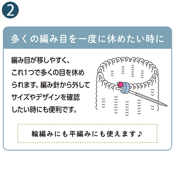 輪編みにも平編みにも使え、一度に多くの編み目を休めたいときに適しています。