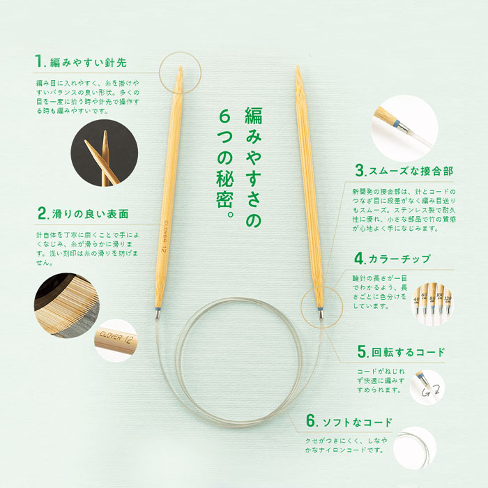 「編みやすい針先」 、「滑りの良い表面」、「段差がないスムーズな接合部」、「コードがねじれず快適な回転するコード」、「ソフトなコード」、編みやすさにこだわり、全てがアップグレードしました。