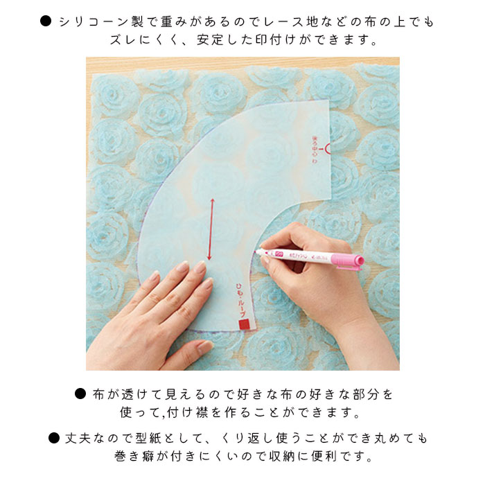 シリコーン製で重みのあるテンプレートなので、レース地などの布の上でも ズレにくく、安定したしるし付けができます。