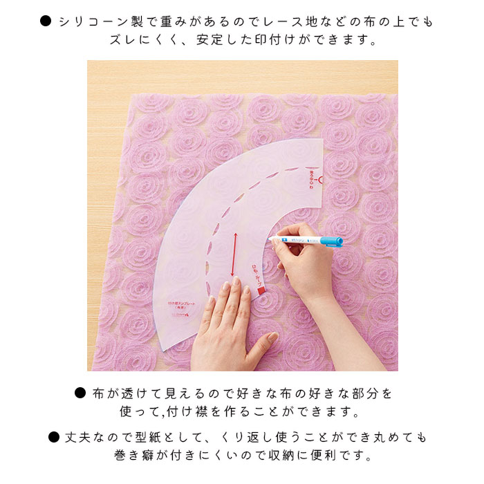 シリコーン製で重みのあるテンプレートなので、レース地などの布の上でも ズレにくく、安定したしるし付けができます。