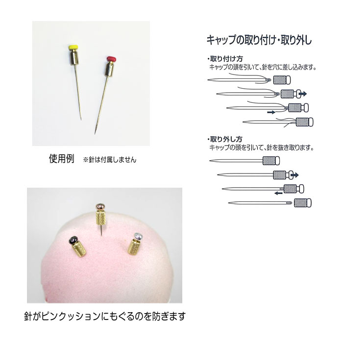 キャップを針穴の方に付けると、針がピンクッションにもぐるのを防ぎます。