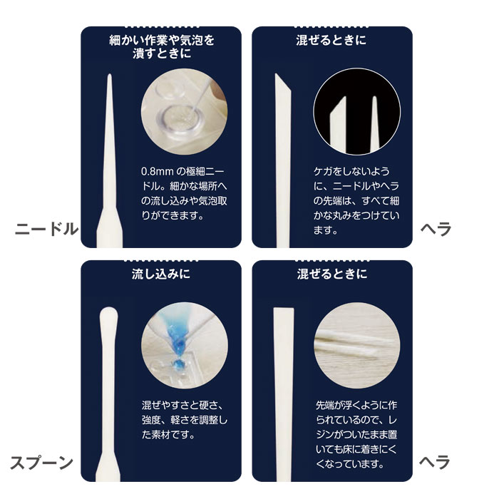 スプーンで着色剤などの取り出し、ピックで気泡取りや細かなモールドへの流し込みなど、様々な用途に使用できます。