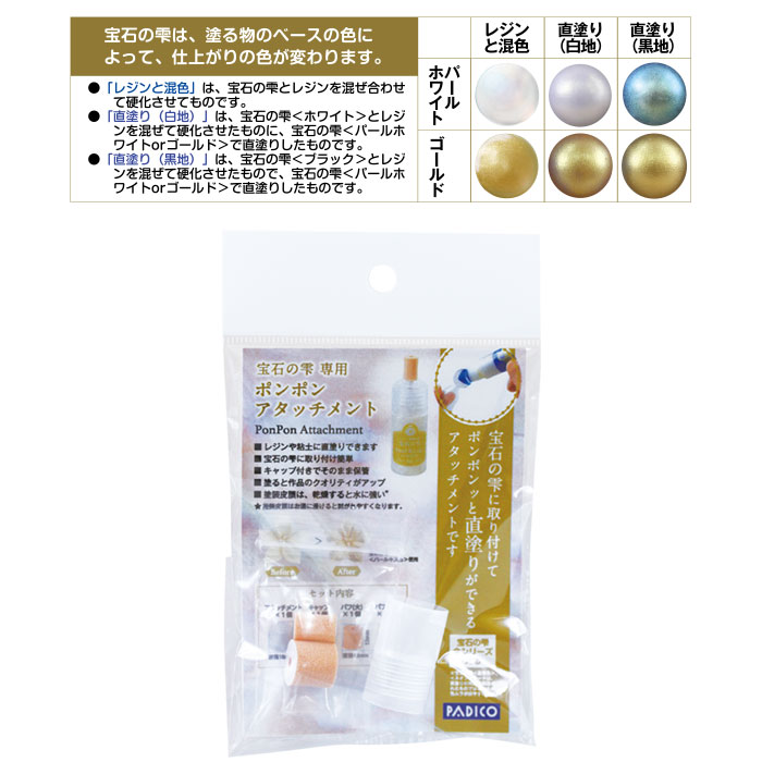宝石の雫パールシリーズは、レジンと混ぜるのはもちろん、専用アタッチメントを付ければ上から直接ポンポンと塗れるようになりました。