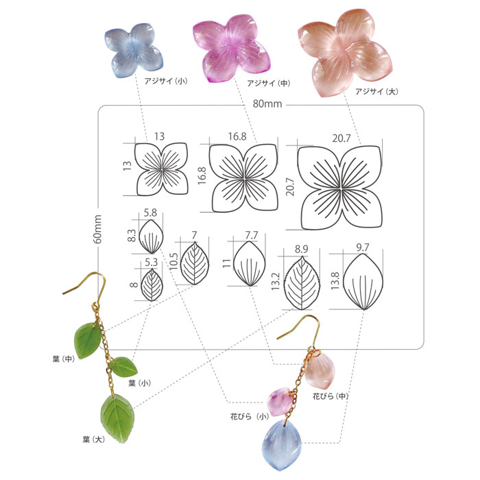 ・3サイズ(大・中・小)のアジサイ、花びら、葉が作れます