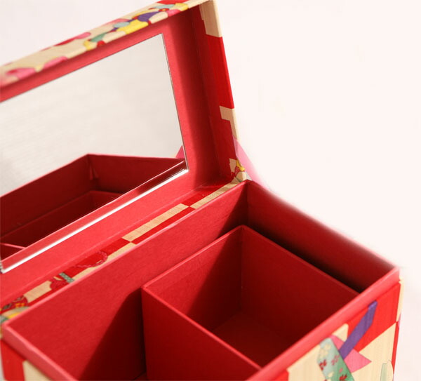 どこかなつかしさを感じるレトロなうさぎ柄を使用した鏡付きのボックスです。中に移動式の小箱も入っているのでアクセサリーやメイクボックスとしてご使用頂けます。各色共に、内側のデザインは同じです。