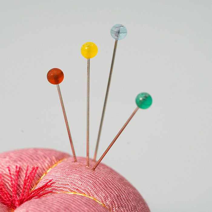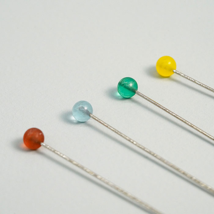 針頭にカラーのガラス玉がついた和裁用の待ち針です。針が長く細いため、絹物でも留め跡が残りにくいタイプとなっております。