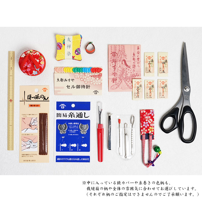 ■セット内容:京友禅裁縫箱 掛子付、こっぽり小物入れ、京都本みすや針5種(四ノ二・四ノ五・三ノ二・三ノ五・大ちゃぼ)各5本入、セル御待ち針(20本入)、ほつれのん、裁ちばさみ20cm、リリヤーン巻糸切り鋏(ハサミカバー・鈴付)、糸巻き(大)3枚組、セルゆびぬき1個、糸通し2枚組、紐通し3本組、ものさし20cm、リッパー、毛抜き