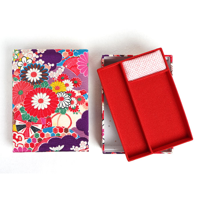 華やかな京友禅の着物柄の裁縫箱にお針しごとに必要な道具を14品揃えました。御結婚やお誕生日のお祝いなど、贈答品として最適です。
