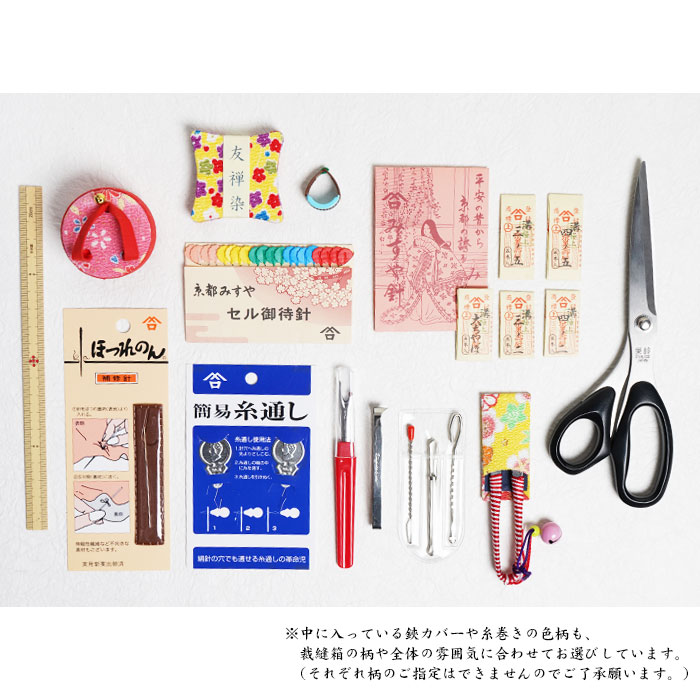 ■セット内容:京友禅裁縫箱 掛子付、こっぽり小物入れ、京都本みすや針5種(四ノ二・四ノ五・三ノ二・三ノ五・大ちゃぼ)各5本入、セル御待ち針(20本入)、ほつれのん、裁ちばさみ20cm、リリヤーン巻糸切り鋏(ハサミカバー・鈴付)、糸巻き(大)3枚組、セルゆびぬき1個、糸通し2枚組、紐通し3本組、ものさし20cm、リッパー、毛抜き
