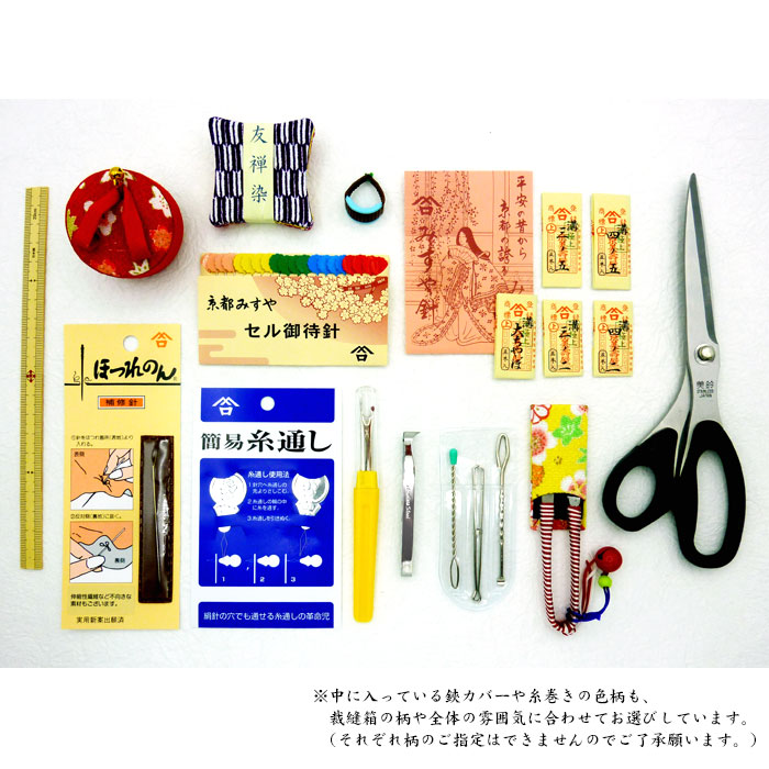 ■セット内容:京友禅裁縫箱 掛子付、こっぽり小物入れ、京都本みすや針5種(四ノ二・四ノ五・三ノ二・三ノ五・大ちゃぼ)各5本入、セル御待ち針(20本入)、ほつれのん、裁ちばさみ20cm、リリヤーン巻糸切り鋏(ハサミカバー・鈴付)、糸巻き(大)3枚組、セルゆびぬき1個、糸通し2枚組、紐通し3本組、ものさし20cm、リッパー、毛抜き