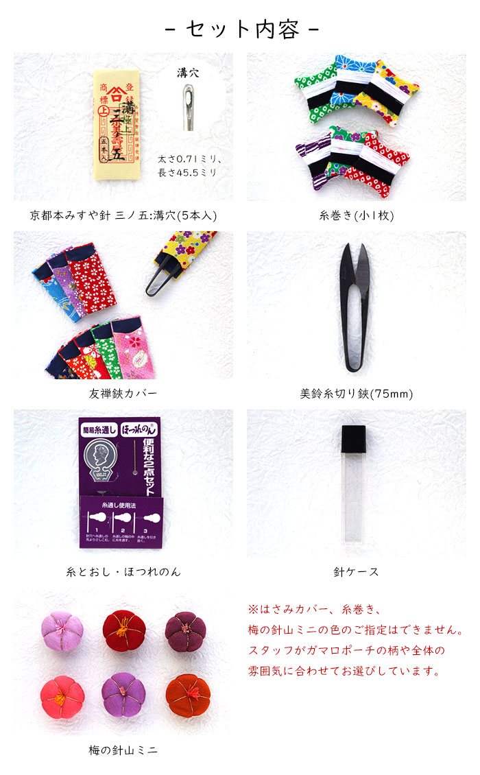また、中に入っている鋏カバー・糸巻き・梅の針山ミニの色のご指定もできません。