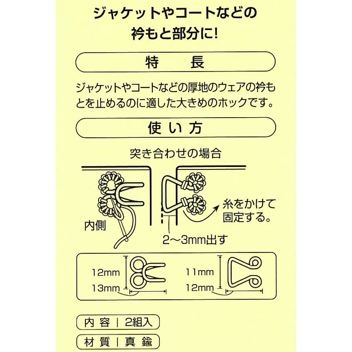 大きくて使いやすいホックです。 厚手のつきあわせのジャケットやコートなどのホックに。ニッケルフリーのホックです。